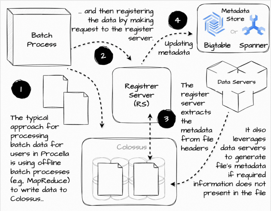 The typical approach for processing batch data for users in Procella is using offline batch processes (e.g., MapReduce) and then registering the data by making a DDL RPC to the register server.