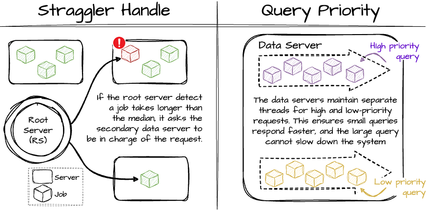 - The root server decorates the priority information for each request to the data servers. Generally, smaller queries will have higher priority, and larger ones will have lower priority. The data servers maintain separate threads for high and low-priority requests. This ensures small queries respond faster, and the large query cannot slow down other queries.