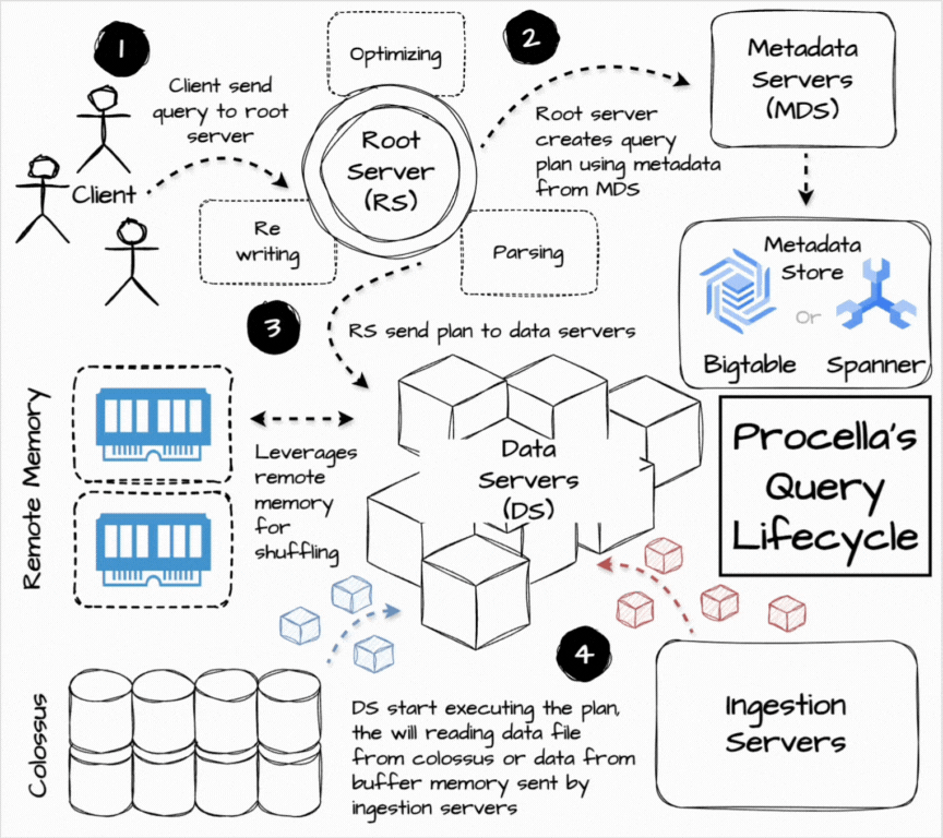 Let’s see how the internal query flows in Procella.