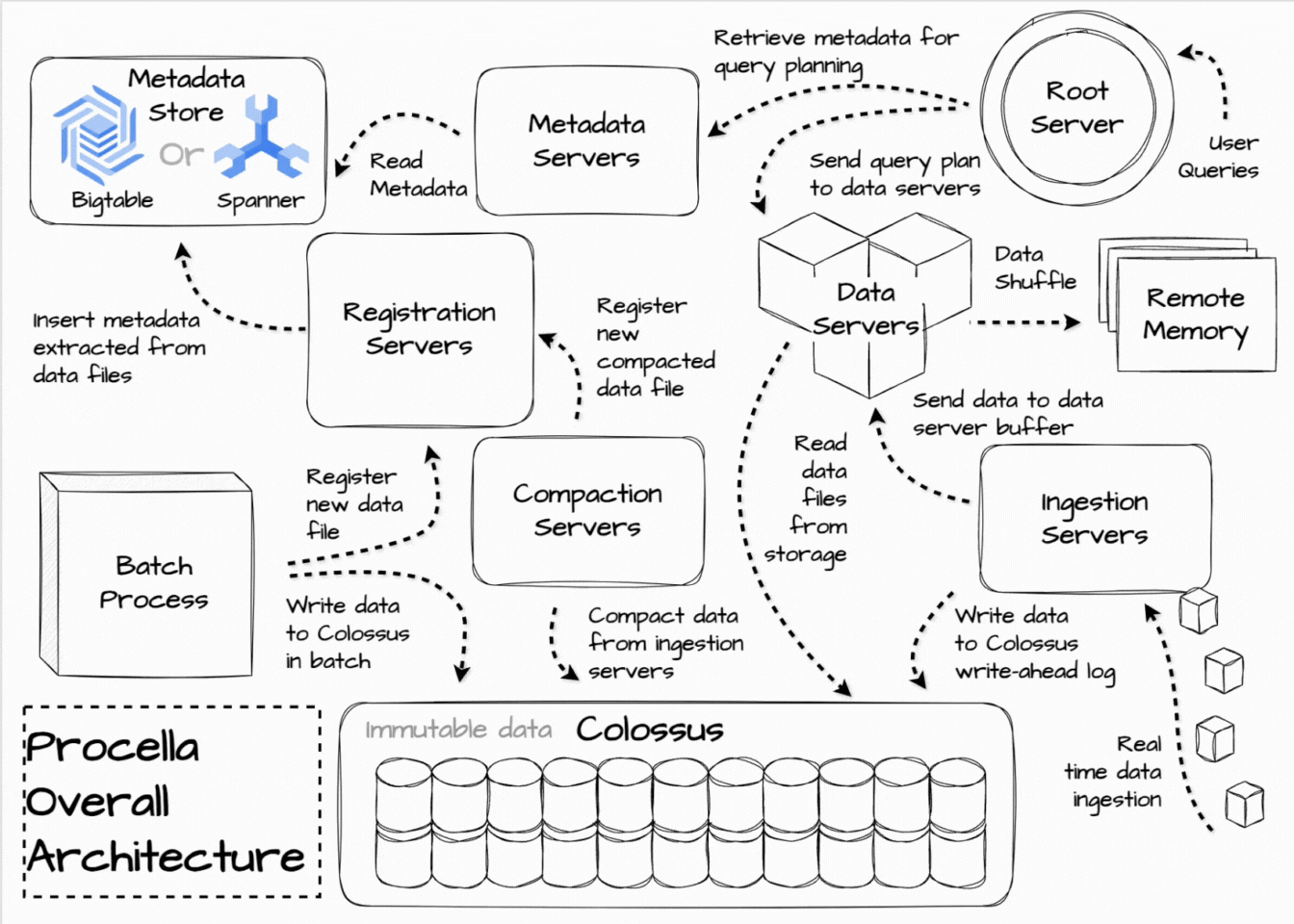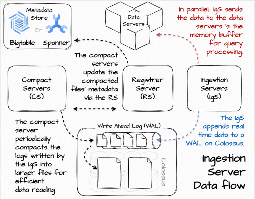 In Procella, the ingestion server is in charge of real-time data ingestion. Users can stream data into it using RPC or PubSub. When receiving the data, the ingestion server can apply some transform to align it with the table’s structure and append it to the write-ahead log in Colossus. They also send the data in parallel to the data server for real-time queries based on the data partitioning scheme. The data servers temporarily store data in the memory buffer for query processing.