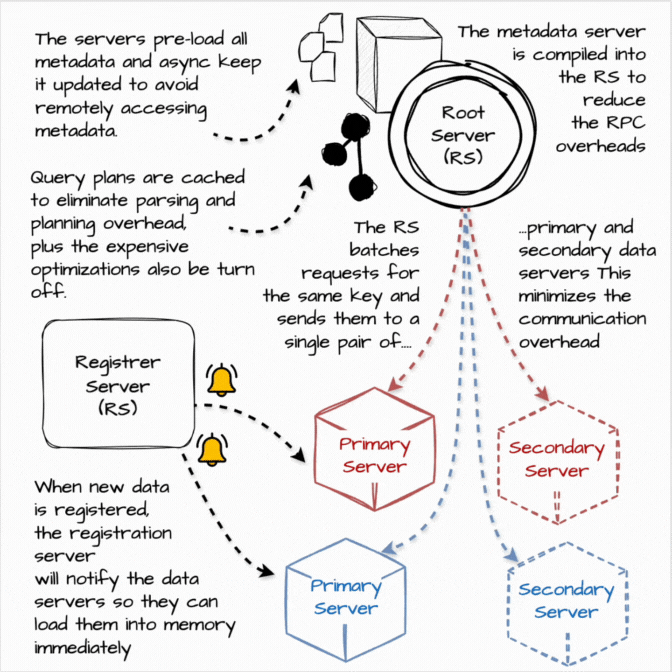 The root server batches requests for the same key and sends them to a single pair of primary and secondary data servers. This minimizes the number of RPCs required to serve simple queries.