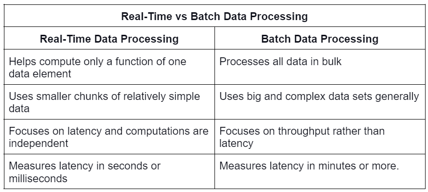 - Data volume is high - Low latency (tens of milliseconds) (requires real-time response time and access to fresh data) |